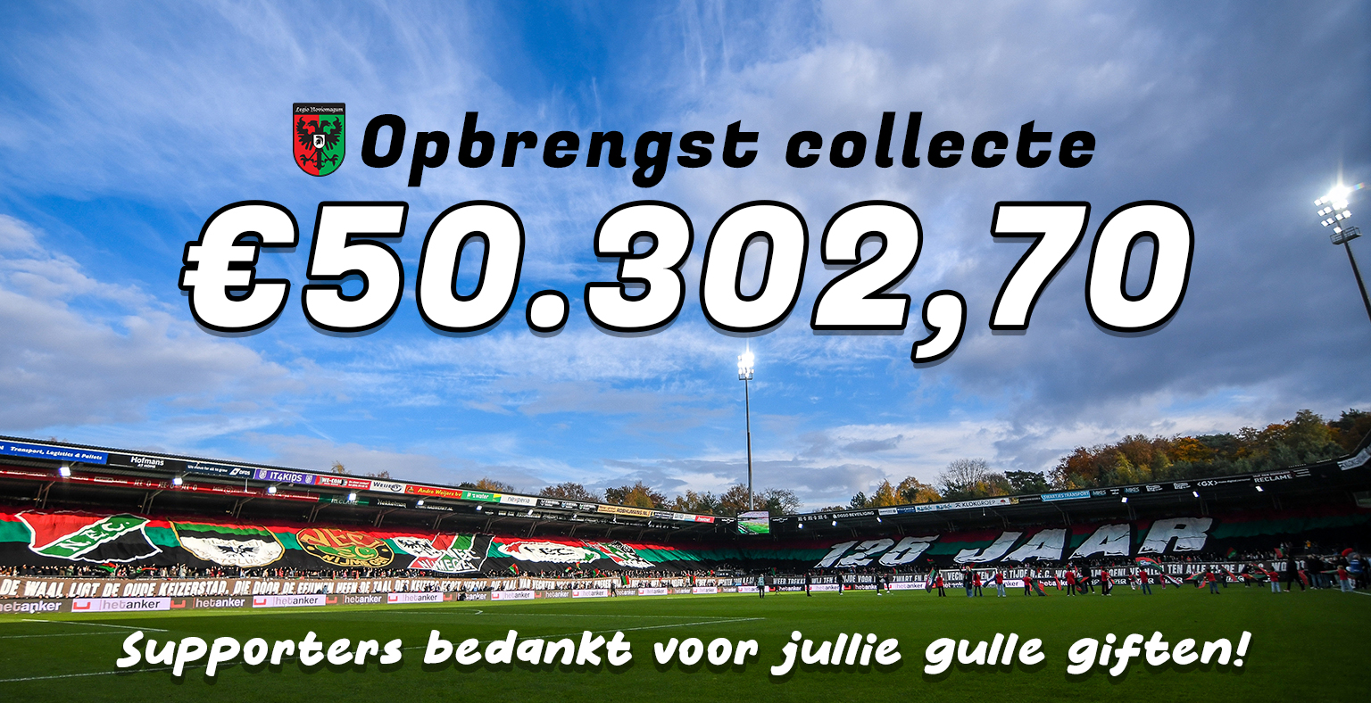 Afgelopen zondag bij de thuiswedstrijd tegen Heerenveen, stonden wij gewapend met pinapparaten, QR codes en collectebussen paraat. Dit voor de jaarlijkse collecte. Waar wij er altijd voor gaan om zo veel mogelijk geluid te produceren, werden wij wel stil van het totaalbedrag. Maar liefst €50.302,70 is er gedoneerd!